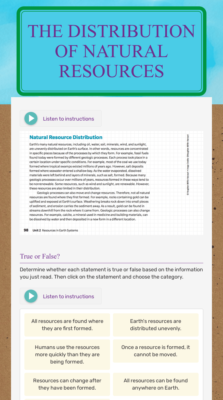 Which natural resources do you use? In this science and technology unit, students identify earth's resources, including water, soil and minerals and describe how they are used in a variety. Students explore earth's resources by classifying objects as resources that could be. Materials list, rubric, worksheets, and answer key are provided. Natural resources worksheet earth science activities, science stations, earth .